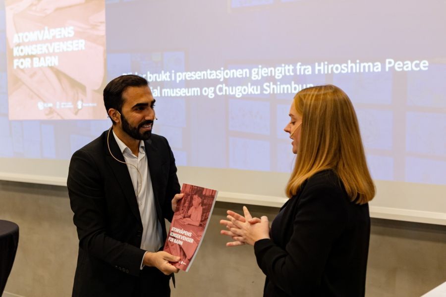 Statssekretær Mushtaq mottar rapporten fra daglig leder Maja Fjellvær Thompson. Foto: Olav Helland Rapporten "Atomvåpens konsekvenser for barn" dokumenterer hvordan atomvåpen rammer barn hardest, både i øyeblikket de brukes og i tiårene som følger. – Barns rett til beskyttelse i krig er absolutt. Likevel viser historien at barn alltid rammes hardest når atomvåpen brukes. Norge har et humanitært ansvar for å stå opp for barns rettigheter og arbeide for en verden fri for atomvåpen, sier Maja Fjellvær Thompson, daglig leder i Norske leger mot atomvåpen. Hver dag blir barn drept eller skadet i væpnede konflikter rundt om i verden. Tusenvis av barn, inkludert mange spedbarn, er nå talt opp blant de døde i de pågående krigene på Gaza og i Ukraina. I begge tilfeller er hovedansvarlige for volden mot barn stater bevæpnet med kjernevåpen; og i enhver krig som involverer én eller flere slike stater, finnes det en iboende risiko for en kjernefysisk katastrofe. Rapporten viser at konsekvensene av atomvåpenbruk og prøvesprengninger påfører barn livslange helseplager, psykiske traumer og økt risiko for tidlig død. Krever politisk handling Rapporten retter en tydelig oppfordring til norske myndigheter: Norge må signere og ratifisere FNs atomvåpenforbud, og bidra aktivt til internasjonal avskaffelse av atomvåpen. – Norge har vært og er en forkjemper for barns rettigheter og humanitær nedrustning. Når det kommer til atomvåpen er Norge derimot en brems som legitimerer disse masseødeleggelsesvåpnene og skjermer atomvåpenstatene for press om nedrustning. Regjeringen må ta et klart standpunkt mot atomvåpen, det mest inhumane våpenet som finnes, sier Tuva Widskjold, koordinator i ICAN Norge Et spørsmål om sikkerhet Rapporten understreker at barn, som aldri har hatt noen rolle i utviklingen av atomvåpen, likevel er de som vil lide mest dersom slike våpen brukes igjen. Norske leger mot atomvåpen, Redd Barna og ICAN Norge ber derfor regjeringen om å føre en politikk som beskytter barn mot denne trusselen, både nasjonalt og internasjonalt. - Vi kan ikke skille sikkerhetspolitikk fra atomvåpens konsekvenser. Norge må øke innsatsen for å beskytte oss alle fra den grusomme risikoen atomvåpen innebærer, avslutter Fjellvær Thompson. Rapportlanseringen Rapporten ble lansert på Legenes hus den 18. november 2025. På lanseringen deltok Usman Mushtaq, statssekretær for Helse- og omsorgsministeren, som mottok funnene i rapporten. I den påfølgende panelsamtalen deltok Gunvor Knag Fylkesnes fra Redd Barna, Nina Pedersen fra Røde kors og Maja Fjellvær Thompson fra Leger mot atomvåpen. Samtalen om hvordan vi kan beskytte barn mot de katastrofale virkningene av atomvåpen ble ledet av Tuva Krogh Widskjold, koordinator i ICAN Norge. Hovedfunn i rapporten Atomvåpens konsekvenser for barn bygger på vitnesbyrd fra overlevende, nedskrevne fortellinger, forskning og arkivmateriale fra områder utsatt for bruk av atomvåpen og prøvesprengninger. Materialet viser hvordan barns små og sårbare kropper tåler trykk, stråling og varme dårligere enn andre. Prøvesprengninger, blant annet på Marshalløyene, Fransk Polynesia og i Kasakhstan har påført barn alvorlige sykdommer. Barn er betydelig mer utsatt for varme, trykkbølge og stråling ved et atomangrep enn voksne. Fostre og små barn har langt høyere risiko for dødelige og livsvarige skader etter stråling. Psykiske traumer, fattigdom, sult og tap av foreldre rammer barn hardest i etterkant av atomvåpenbruk. Vi takker alle som møtte opp på lanseringen eller fulgte med på stream! Rapporten kan leses her.