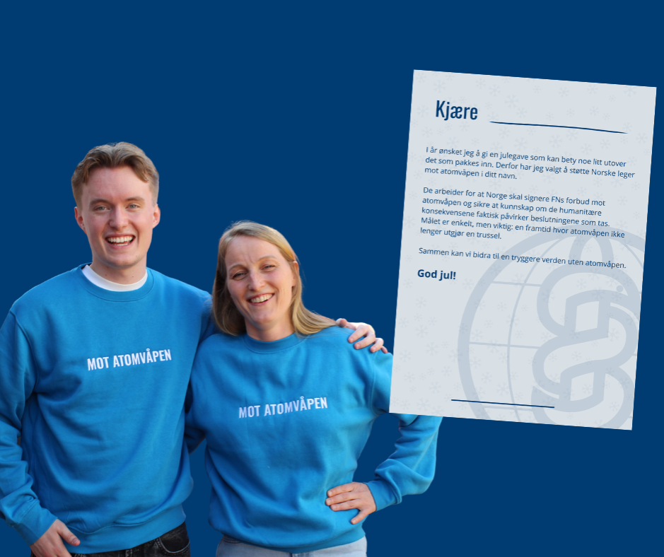I år kan du støtte Norske leger mot atomvåpen og samtidig gi en meningsfull julegave! Doner en valgfri sum på vegne av noen du er glad i, så sender vi deg et fint brev til å legge under treet og en av våre fine gensere. En varm påminnelse om at du bidrar til en framtid uten atomvåpen! Sammen kan vi bidra til en tryggere verden uten atomvåpen. Gi en gave til Norske leger mot atomvåpen her og vi tar kontakt via e-post for å sende deg brev du kan legge under treet og en genser!
