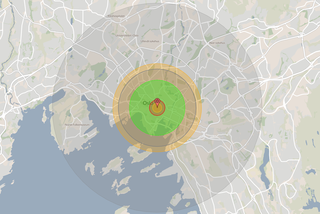 I 2012 utviklet Alex Wellerstein verktøyet NUKEMAP. Det gir deg muligheten til å utforske nettopp disse spørsmålene. Ved å velge en by og et atomvåpen av ulik størrelse, kan du få et inntrykk av konsekvensene av en detonasjon - hvor som helst i verden.