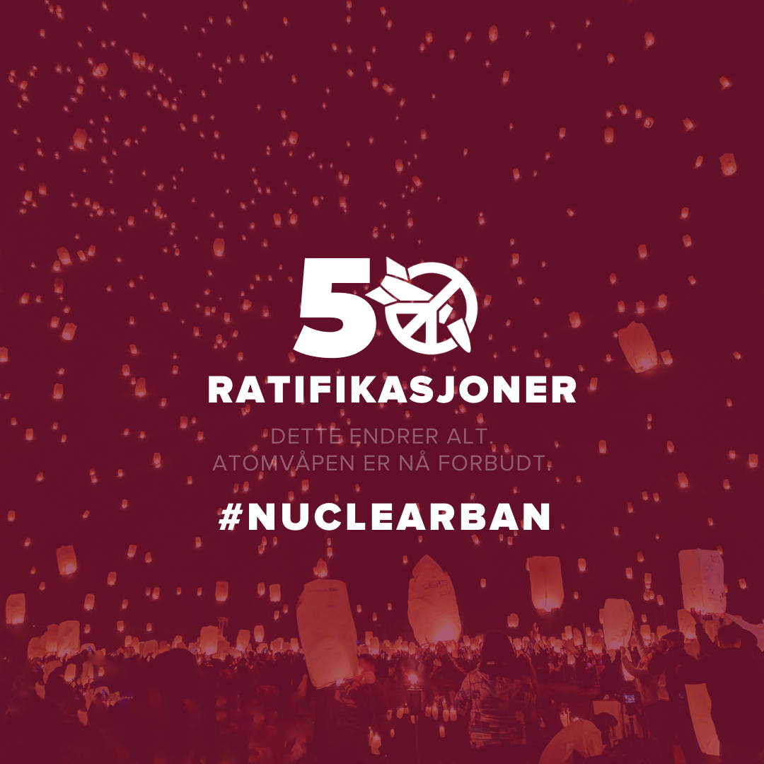 - Femti ratifikasjoner betyr at atomvåpen blir forbudt etter internasjonal folkerett. Natos generalsekretær har sagt at atomvåpen er nødvendige for fred og frihet. Norske leger mot atomvåpen vet at det motsatte er tilfellet. Så lenge atomvåpen eksisterer risikerer vi at de blir brukt, med katastrofale følger. Vi må avskaffe atomvåpen for å sikre fred og frihet, seier Signe Flottorp, styreleiar i Norske leger mot atomvåpen.