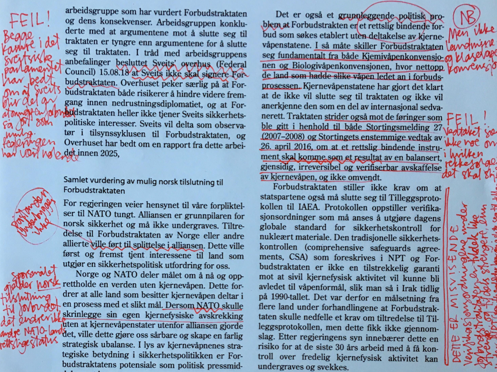 - En ny folkerettslig norm mot atomvåpen er etablert og vil forsterkes i tiden framover. Norge bør ikke stå i veien for denne utviklingen, men støtte opp under prosessen som FN-majoriteten har drevet fram. Atomvåpen kan ikke lenger forbindes med makt og prestisje, men må stigmatiseres på lik linje med andre masseødeleggelsesvåpen. Det må bli en belastning å ha og true med å bruke atomvåpen.