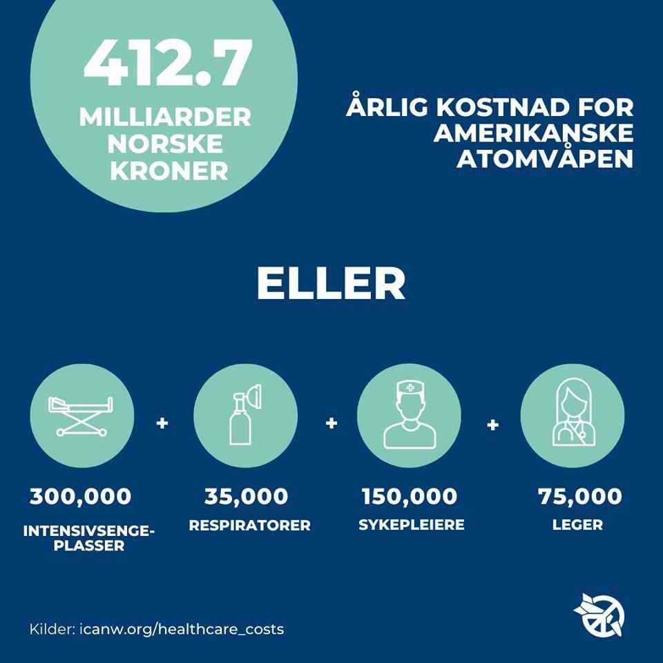 Det er  grunn til å minne om prisen for NATOs atomvåpen. Frankrikes årlige atomvåpenutgifter er på 57,2 milliarder norske kroner. Dette kunne betale 100 000 sykehussenger, 10 000 respiratorer, 20 000 sykepleiere og 10 000 leger. Storbritannias årlige utgifter er 97,1 milliarder kroner og USAs 412,7 milliarder kroner. For disse pengene kunne verden løse alle de helseproblemer koronakrisen har satt den i.