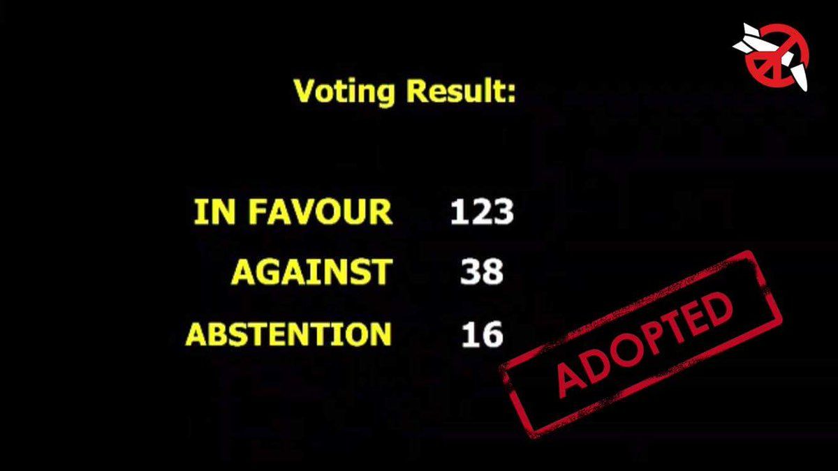 At a meeting of the First Committee of the UN General Assembly, which deals with disarmament and international security matters, 123 nations voted in favour of the resolution, with 38 against and 16 abstaining.
